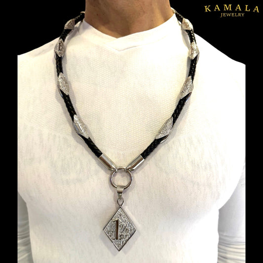 NEU - 1%er Halskette - Schwarzem Leder & Silber - Raute Design