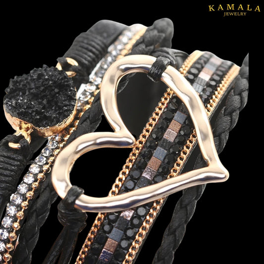 Breites Lederarmband mit Goldenem Herz - Schwarz